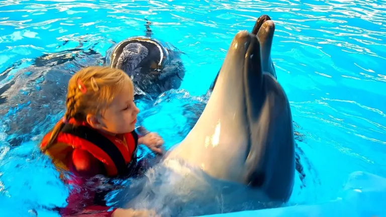 Дельфинотерапия– это комплексное воздействие на организм. Оно складывается из ультразвуковых волн, излучаемых дельфином, двигательной активности, пребывания в морской воде, обладающей определенными целебными свойствами. И, конечно, мощного психологического эффекта. Дельфин побуждает человека, находящегося с ним в бассейне, к общению — совместному плаванию, играм, невербальному обмену информацией. И в результате мы получаем настолько эффективное и позитивное воздействие, которого не могут дать самые современные лекарства.